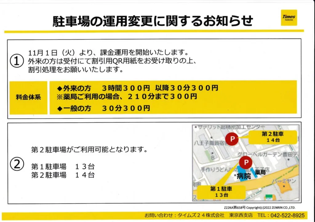 | 所在地 | 〒192-0033 東京都八王子市高倉町36−1 | 駐車場 | 詳しくはこちらクリックしてください。、 有料パーキング有/第1駐車場13台、第2駐車場14台 ◇外来の方 3時間まで300円、以降30分300円 ※受付にて割引用QR用紙配布 ◇一般の方 30分300円 ※入院の送迎や面会の方は割引の対象となりませんので、ご了承下さい。 |